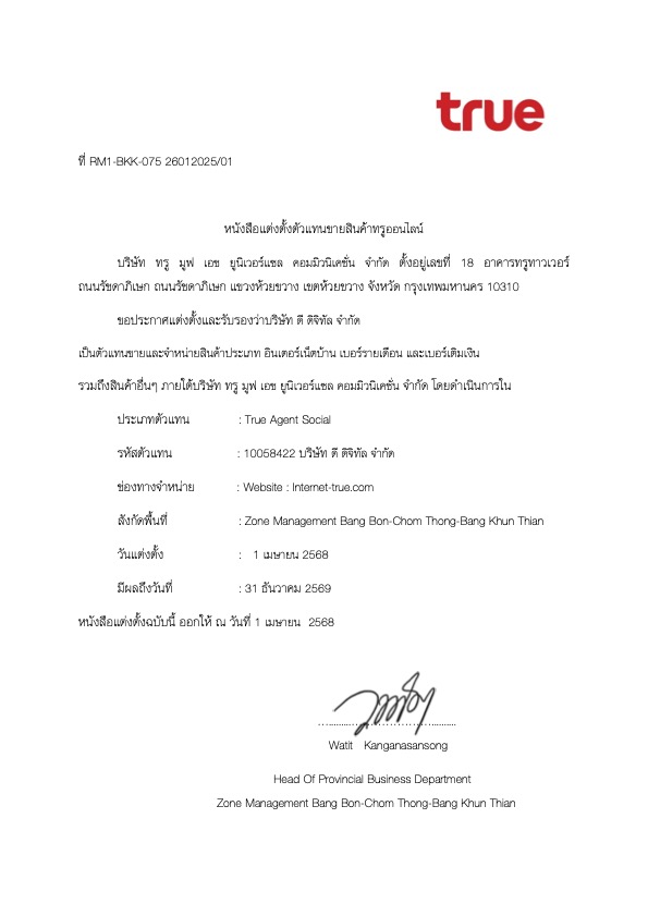 - ประสานงานกับเจ้าหน้าที่หรือตัวแทนของทรูในการติดตั้ง